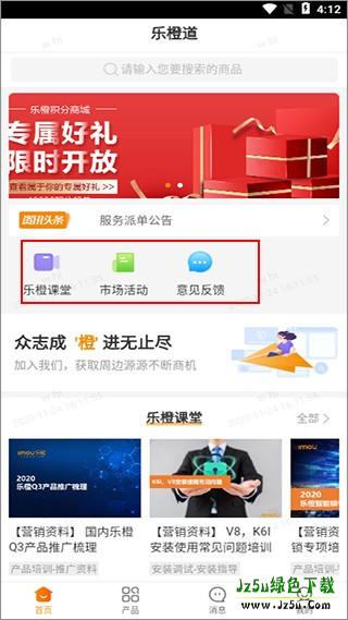 2、用户在软件首页可以看到乐橙课堂,市场活动和意见反馈功能;