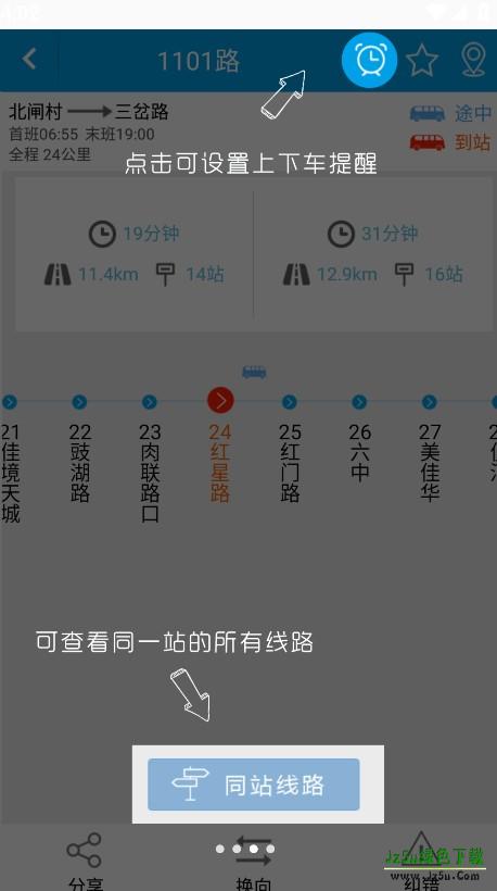4、当我们选择一个路线时,点击右上角的闹钟按钮,即可设置上下车提醒。点击下方的同站线路即可查看同一站的所有线路。