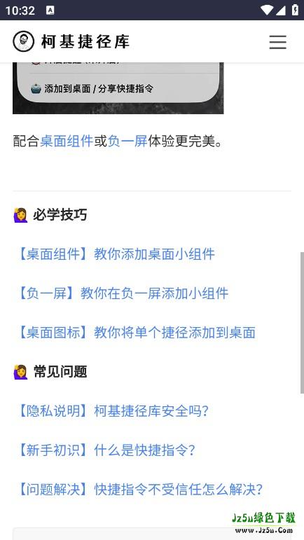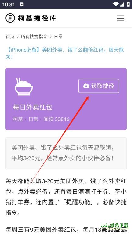 然后通过手机自带的 Safari 浏览器打开链接,此时会自动跳转到柯基捷径库 APP,按照提示点击 “获取捷径” 将其添加到 APP 中。