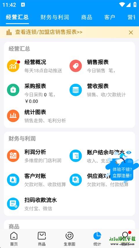 5、在统计页显示了经营汇总、财务利润、商品和客户等功能页面,帮助您了解店铺运营状况。