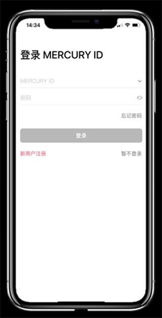 1、下载安装水星安防监控,打开MERCURY安防APP,输入MERCURY ID的账号和密码,点击 登录。如果没有MERCURY ID,请点击 新用户注册,按照提示注册MERCURY ID。