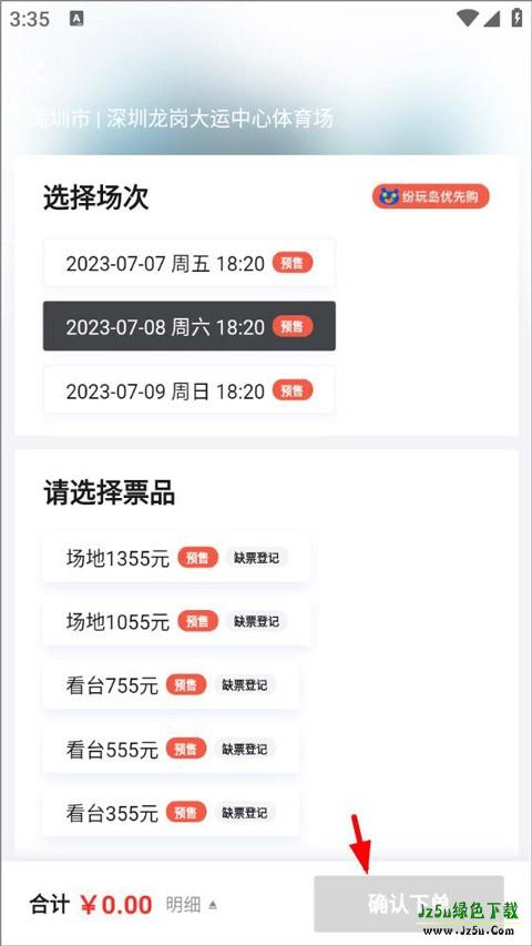 4、进入购票页面,用户需要选择合适的场次、票品,并确认下单。