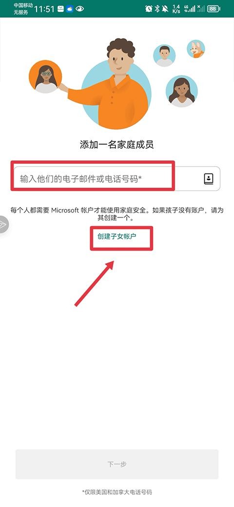 2、然后再框内输入他们的电子邮箱和电话号码,若孩子没有账户,可以点击下方创建子女账户