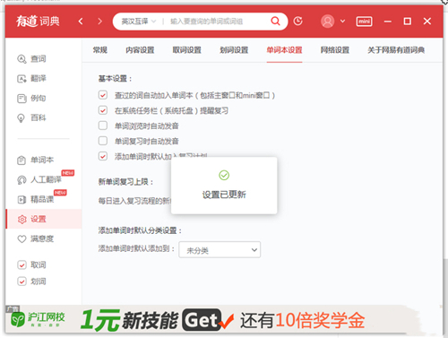点击有道翻译软件设置-单词本设置-勾选第一个