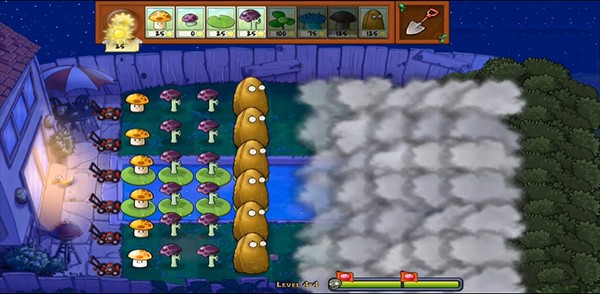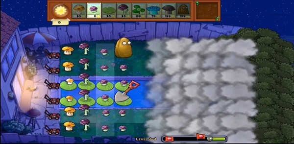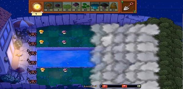 4、大家可以看到此版本与其他版本有很大的不同,上面有一层云遮挡,所以你不知道对面来了多少僵尸,可以说非常的刺激。