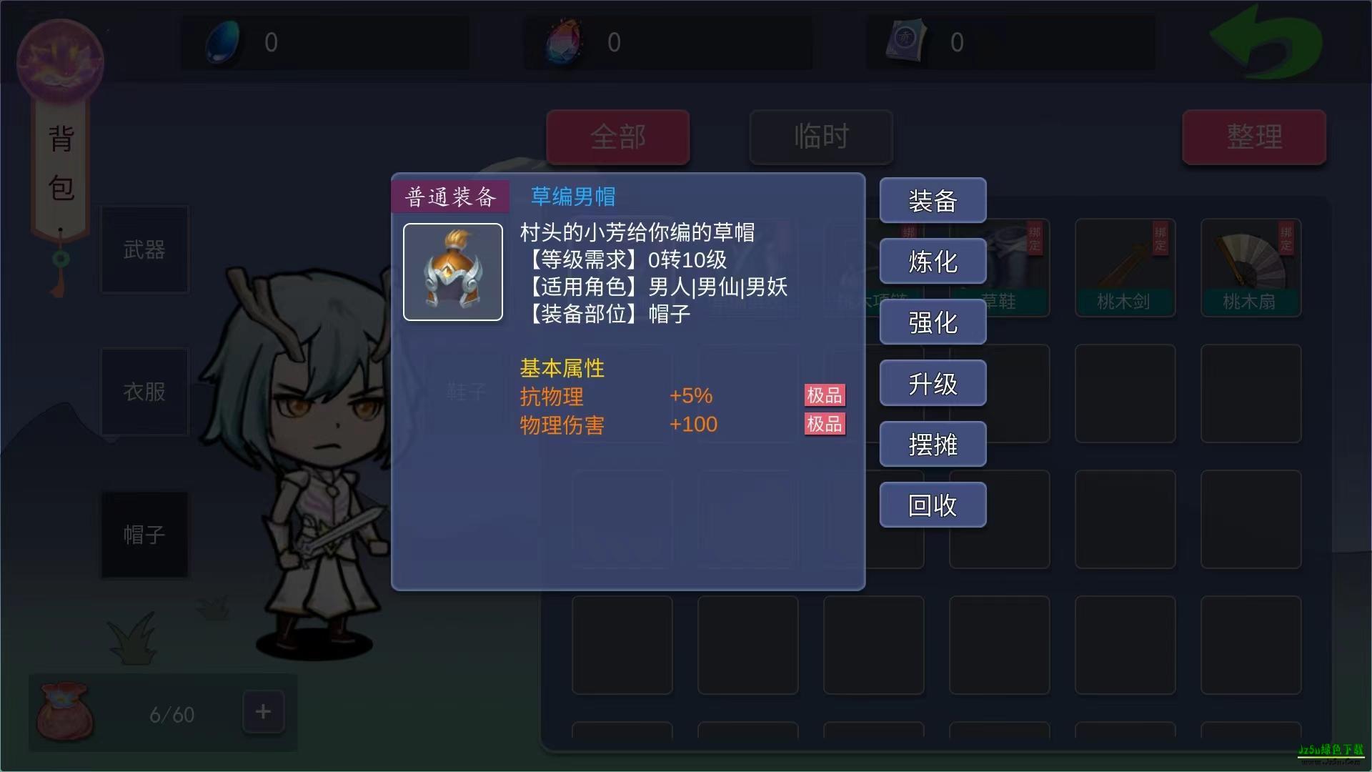 9、点击相应的装备可以查看详细的属性说明,还可以进行装备、炼化、强化、升级、摆摊和回收等操作,