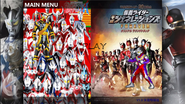 1、进入游戏首页,我们可以看到角色是奥特曼和假面骑士,点击play;
