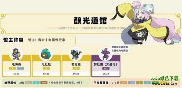 酿光市电馆主奇树,四只宝可梦,大将是24级的梦妖魔,太晶电之后有点难打!抓一只地面系的乌波,进化后可完封奇树。