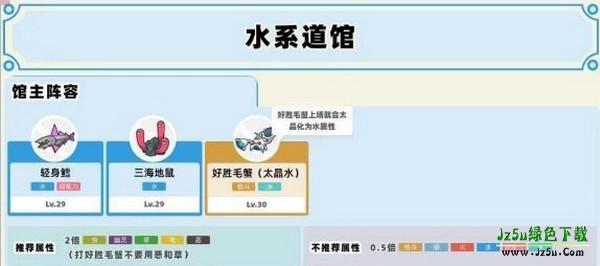 玻瓶镇的水馆主海岱,三只宝可梦,最高级是30级的好胜毛蟹,不要用草猫打它!这玩意可不是水系哦!虽然他后面还是会太晶水。。此时换上一只电系比如咩利羊打他就行了。