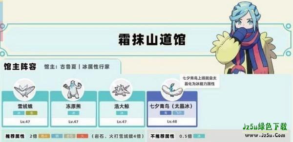 霜抹山冰系馆主古鲁夏!这是最后一个道馆了,你大可以暂时不打,先去到处溜达升级,到处都是火系宝可梦,随手抓只卡蒂狗用火焰石进化即可完美克制他!