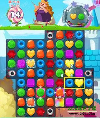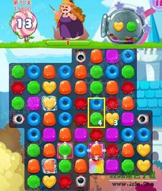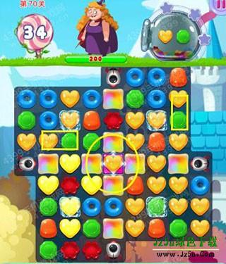 虽然本关胖女巫生命值有200,但在导弹糖果的加持下,其实难度也没想象的大。只要把中间获得加持效果做好的彩虹糖位置打通,然后把黄绿两色糖果都击中在这个地方来消除即可。