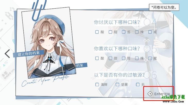 4、完成建立档案后会出现6道简单的问卷题,当然也可以选择不填,直接点击右下角的Enter开始;