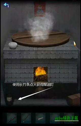 使用长竹条在厨房的灶台处取火,点燃煤油灯。