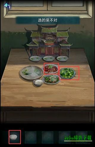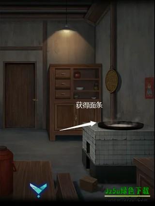 7、在厨房点击面获得一碗面条,去到有灯笼的那个房间,点击桌上纸房子的门,获得纸条提示;
