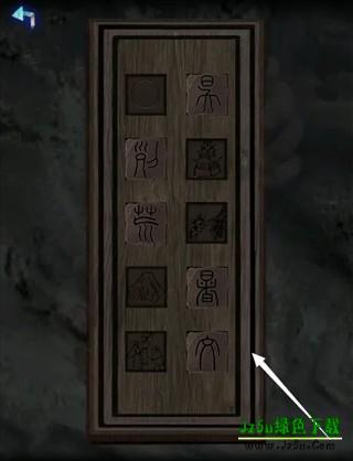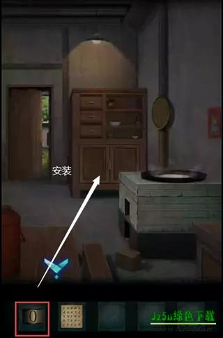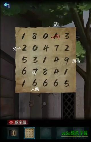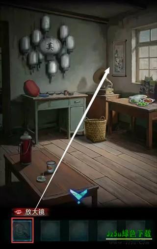 9、使用铁架在厨房风箱处获得白色圆石头,使用铁铲在大门口紫花处获得放大镜,使用放大镜在有灯笼的房间内的画上可看见五个字符,且每个字符对应不同的图案,根据字符对应点击放拨浪鼓的盒子,获得拨浪鼓。