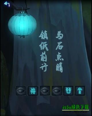 13、点击灯笼串最底下那个,获得白灯笼,将白灯笼挂在左边的墓碑上,可看见上面的字和密码锁,根据文字为石点睛可知需要根据石碑上白点的提示点击与其相对应的字,六个墓碑中有三个是纸墓碑,不需要考虑,只需要考虑石碑白点与灯笼对应的文字即可。