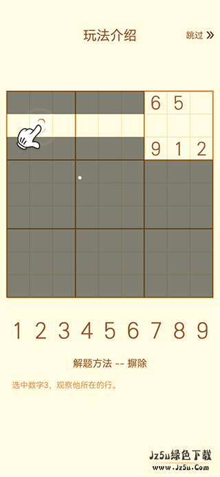1、摒除:选中数字3,观察它所在的行,由于一行只能出现一个3,所以这一行中的其他单元格都不可能是3