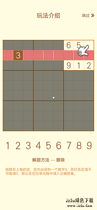 2、观察右上角的宫,宫内必须要有一个数字3,而红色区域不可能填3,那么这个空白单元格中只能填入数字3