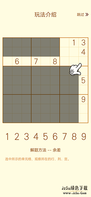 1、行:游戏棋盘中,横向的9个格子被称为行,棋盘共包含9行,每行都由不重复的1-9组成。填入正确数字完成该行。